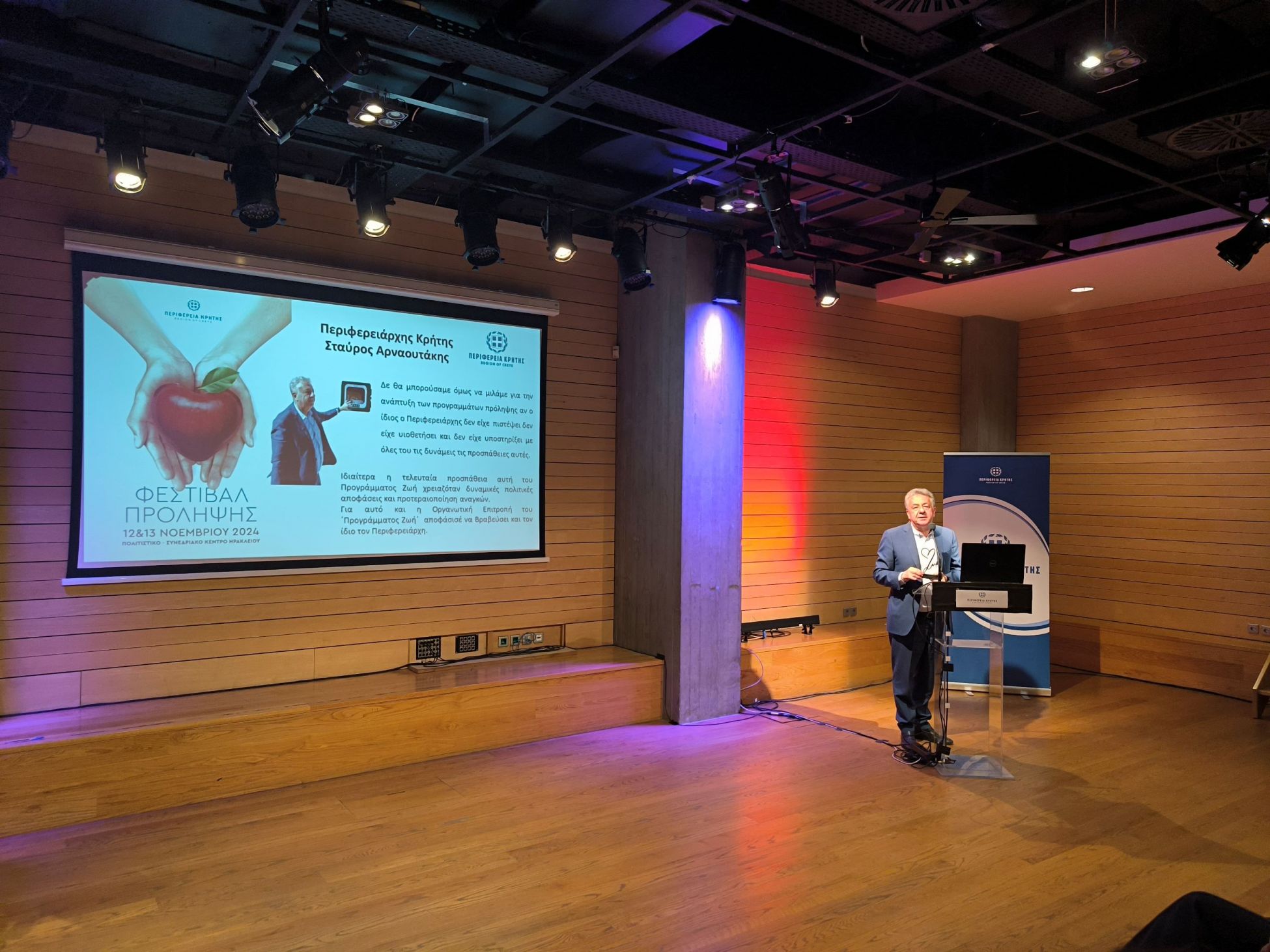 Στον χαιρετισμό του ο Περιφερειάρχης Σταύρος Αρναουτάκης, υπογράμμισε μεταξύ άλλων, ότι, το Φεστιβάλ αυτό επικεντρώνεται στην αξία της ζωής, τονίζοντας ότι, δίνεται νόημα στην πολιτική πρόληψης, διευρύνοντας το πεδίο της δικής μας παρέμβασης, σε κάθε χωριό και γειτονιά της Κρήτης.