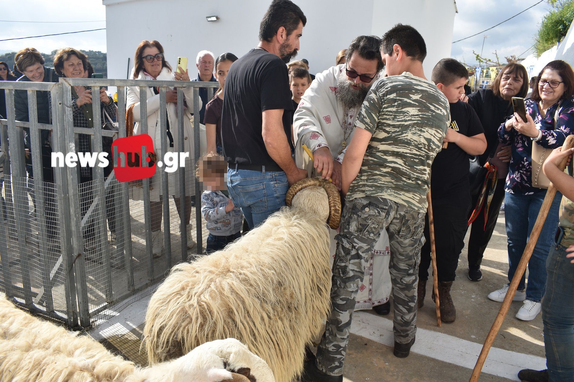 Στην Ασή Γωνιά ο ιερέας ευλογεί τα κοπάδια ραίνοντας τα με αγιασμό και το ίδιο κάνει και με τους βοσκούς που τα έφεραν στην εκκλησία.