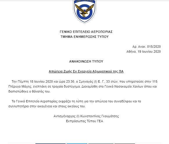 «Την Πέμπτη 18 Ιουνίου 2020 και ώρα 23:30, ο Σμηναγός (Ι) Ε. Γ., 33 ετών, που υπηρετούσε στην 115 Πτέρυγα Μάχης, ενεπλάκη σε τροχαίο δυστύχημα. Διεκομίσθη στο Γενικό Νοσοκομείο Χανίων όπου και διαπιστώθηκε ο θάνατός του. Το Γενικό Επιτελείο Αεροπορίας εκφράζει τη λύπη για την απώλεια του συναδέλφου και τα συλλυπητήρια στην οικογένεια και στους οικείους του».