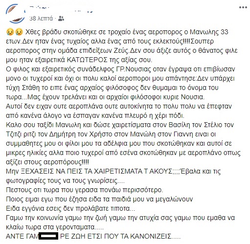 «Χθες βράδυ σκοτώθηκε σε τροχαίο ένας αεροπορος ο Μανωλης 33 ετων.Δεν ηταν ένας τυχαίος αλλα ένας από τους εκλεκτούς!Σουπερ αεροπορος στην ομάδα επιδείξεων Ζεύς. Δεν σου άξιζε αυτός ο θάνατος φιλε μου ηταν εξαιρετικά ΚΑΤΩΤΕΡΟΣ της αξίας σου.