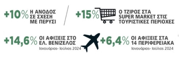 Σε ό,τι αφορά τις τουριστικές ροές, περίπου δύο εκατομμύρια ξένοι τουρίστες αναμένεται να φτάσουν στη χώρα αεροπορικώς τις προσεχείς δύο εβδομάδες, με τις οποίες θα ολοκληρωθεί ένα «καυτό» καλοκαίρι από άποψη εισερχόμενου τουρισμού, σηματοδοτώντας νέο ρεκόρ αφίξεων. Με βάση τα επίσημα στοιχεία, η επιβατική κίνηση στο «Ελευθέριος Βενιζέλος» ήταν αυξημένη 14,6% φτάνοντας τους 17,32 εκατομμύρια επιβάτες στο επτάμηνο Ιανουαρίου - Ιουλίου. Η επιβατική κίνηση, δε, από και προς το εξωτερικό ήταν στο +17,6%, φτάνοντας τους 12,38 εκατομμύρια επιβάτες.