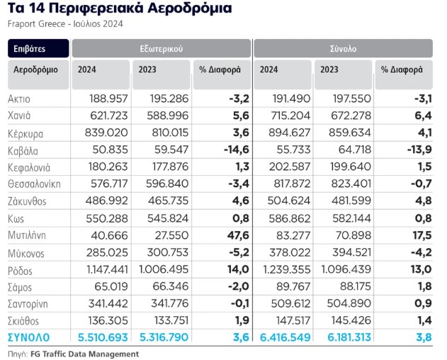 Το ίδιο διάστημα στα 14 περιφερειακά αεροδρόμια που διαχειρίζεται η Fraport η επιβατική κίνηση εμφανίζεται αυξημένη κατά 6,4%, φτάνοντας συνολικά τους 19,11 εκατομμύρια επιβάτες. Η κίνηση από και προς το εξωτερικό αυξήθηκε 6,2% φτάνοντας τους 14,77 εκατομμύρια επιβάτες, τάση που συνεχίζεται απτόητη και αυτόν τον μήνα, όπως καταδεικνύουν τα στοιχεία που έχει επεξεργαστεί η Airdata tracker με δεδομένα της εταιρείας μετρήσεων ταξιδιωτικών δεδομένων OAG.