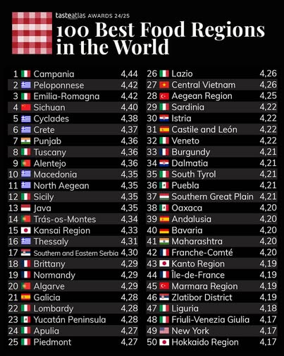 Όπως αναφέρει το Taste Atlas, ο κατάλογος αυτός αναδείχθηκε από 477.287 έγκυρες αξιολογήσεις για 15.478 τρόφιμα και την 1η θέση κατέκτησε η περιοχή Καμπανία της Ιταλίας.