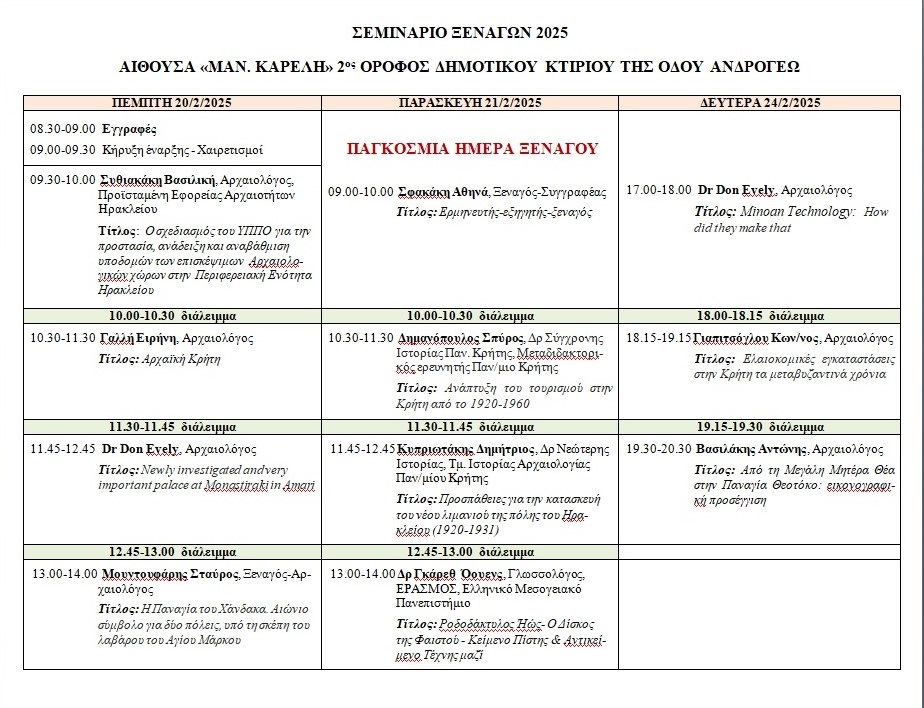 Στη δημοσιότητα δόθηκε το πρόγραμμα του ετήσιου επιμορφωτικού σεμιναρίου του Σωματείου Επαγγελματιών Ξεναγών Κρήτης και Σαντορίνης, που θα πραγματοποιηθεί στις 20, 21 και 24 Φεβρουαρίου 2025, στην αίθουσα "Μαν. Καρέλης" του Δημοτικού κτιρίου της οδού Ανδρόγεω.