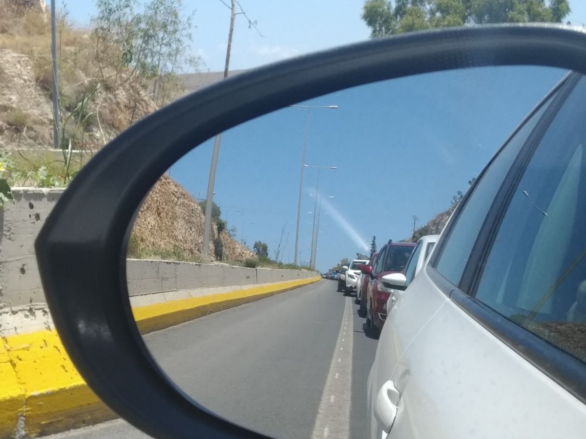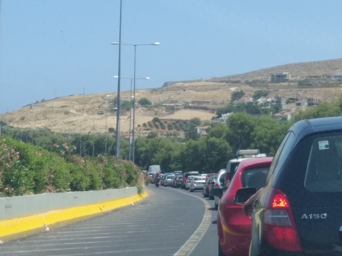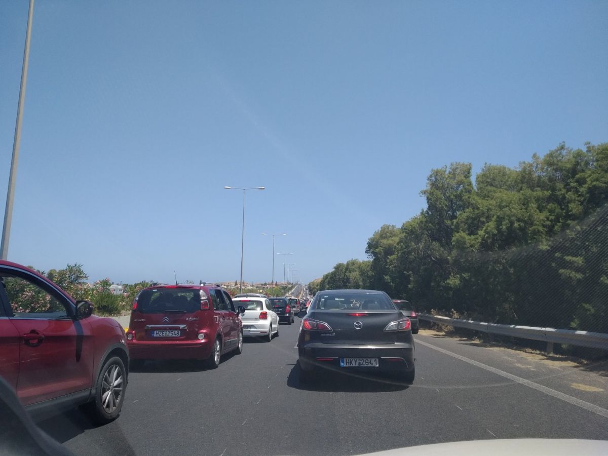Από το ύψος του αεροδρομίου Ηρακλείου ξεκινά μια τεράστια ουρά οχημάτων! Είναι χαρακτηριστικό ότι για μια απόσταση από το ύψος του αεροδρομίου ως την έξοδο για Καρτερο χρειάστηκε αναμονή άνω της μιας ώρας!