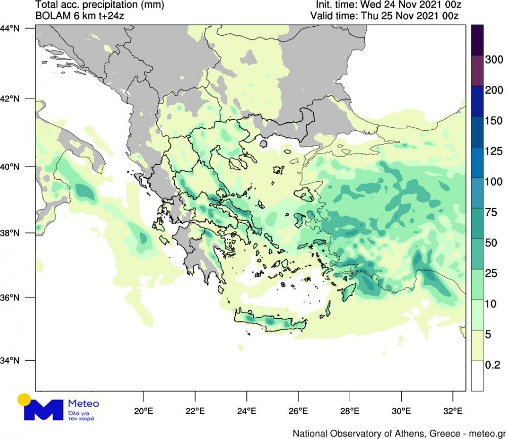 Στα νησιά του Ανατολικού Αιγαίου και τα Δωδεκάνησα αναμένονται και τοπικές καταιγίδες. Απο τις μεσημβρινές ώρες τα φαινόμενα θα εξασθενήσουν στα βόρεια και στα νοτιονατολικά και θα περιοριστούν κατα τόπους στη Θεσσαλία, στην Ανατολική Στερεά, στην Ανατολική Πελοπόννησο, ενώ βροχές και τοπικές καταιγίδες αναμένονται στην Κρήτη οι οποίες θα διαρκέσουν τουλάχιστον μέχρι τις βραδινές ώρες. Στον παρακάτω χάρτη απεικονίζεται ο αθροιστικός υετός που αναμένεται σήμερα Τετάρτη 24 Νοεμβρίου.