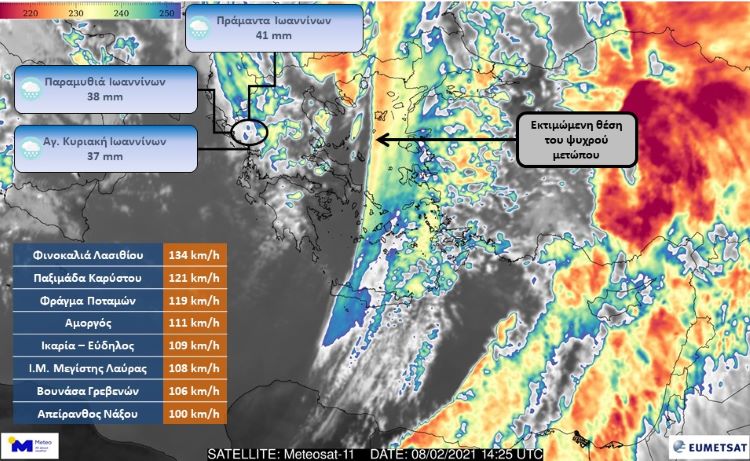 Επίσης, ενσωματωμένοι στη δορυφορική εικόνα, παρουσιάζονται ο πίνακας με τις οκτώ υψηλότερες ριπές ανέμου και οι 3 υψηλότερες καταγραφές βροχόπτωσης της Δευτέρας 08/02, όπως καταγράφτηκαν από το δίκτυο αυτόματων μετεωρολογικών σταθμών του Εθνικού Αστεροσκοπείου Αθηνών / Meteo.gr.