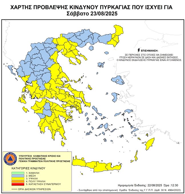 Υψηλός είναι ο κίνδυνος εκδήλωσης πυρκαγιάς για σήμερα Σάββατο 23/08 (κατηγορία 3) στην Περιφέρεια Κρήτης, σύμφωνα με τον Χάρτη Πρόβλεψης Κινδύνου Πυρκαγιάς που εξέδωσε η Γενική Γραμματεία Πολιτικής Προστασίας.