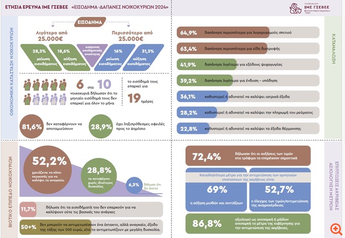 H οικονομική κατάσταση των ελληνικών νοικοκυριών παρέμεινε δύσκολη το 2024, με την πλειονότητα να αντιμετωπίζει σοβαρές προκλήσεις στην κάλυψη των αναγκών του, σύμφωνα με την ετήσια έρευνα του ΙΜΕ ΓΣΕΒΕΕ για το εισόδημα και τις δαπάνες διαβίωσης των νοικοκυριών (13η κατά σειρά).