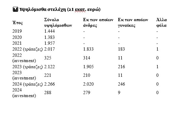 Ο συνολικός αριθμός των υψηλόμισθων στελεχών σε πιστωτικά ιδρύματα και investment έφθασε τα 2.554 . Στα πιστωτικά ιδρύματα ο αριθμός αυξήθηκε κατά 6,8% μόνον ενώ στo χώρο των επενδύσεων αυξήθηκε κατά 30,3%. Αξιοσημείωτο είναι πως στη χώρα μας στελέχη στον επενδυτικό τομέα με τέτοιες αμοιβές δεν υπάρχουν .
