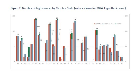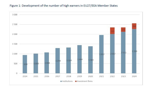 Τα στοιχεία που δημοσιεύει η ΕΒΑ για όλες τις χώρες της Ε.Ε. και αφορούν υψηλόμισθα στελέχη σε ιδρύματα και investment που λαμβάνουν αποδοχές ύψους 1 εκατ. ευρώ ή και περισσότερο ανά οικονομικό έτος, σημείωσαν αύξηση 9% από έτος σε έτος με βάση στοιχεία του 2024. Η συντριπτική πλειοψηφία τους είναι άνδρες.
