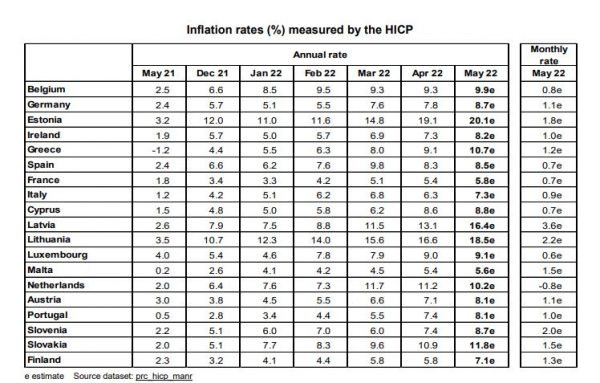 Οι αναλυτές προέβλεπαν αύξηση πολύ μικρότερη στο 7,8%. Για την Ελλάδα εκτιμάται ότι ο πληθωρισμός τον Μάιο ανήλθε σε 10,7%, από 10,2% τον Απρίλιο.