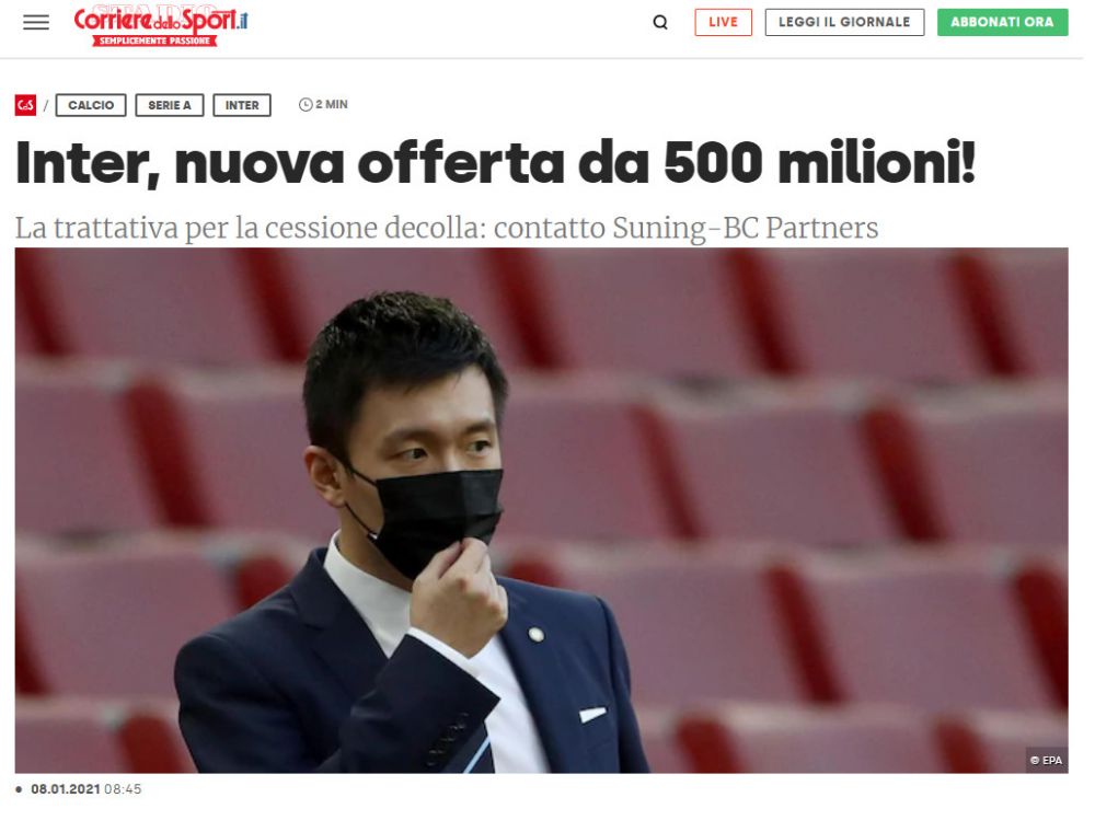 Όπως αποκαλύπτει σήμερα η ιταλική εφημερίδα Corriere dello Sport, η BC Partners είναι διατεθειμένη να προσφέρει 500 εκατ. ευρώ για την αγορά της Ίντερ.