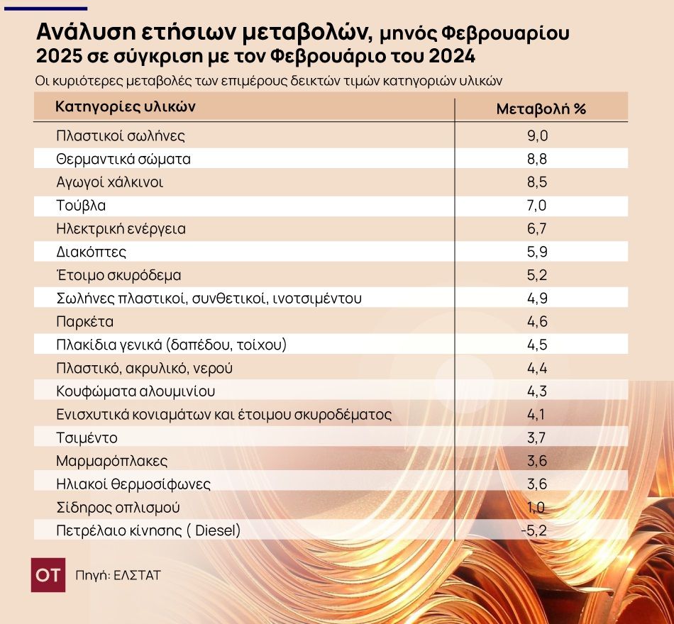 Ειδικότερα, οι τιμές συνέχισαν να κινούνται ανοδικά σε: Πλαστικούς σωλήνες (9%), Θερμαντικά σώματα (8,8%), Αγωγούς χάλκινους (8,5%), Τούβλα (7%), Ηλεκτρική ενέργεια (6,7%), Διακόπτες (5,9%), Έτοιμο σκυρόδεμα (5,2%), Σωλήνες πλαστικούς, συνθετικούς, ινοτσιμέντου (4,9%), Παρκέτα (4,6%), Πλακίδια γενικά- δαπέδου, τοίχου (4,5%), Πλαστικό, ακρυλικό, νερού (4,4%), Κουφώματα αλουμινίου (4,3%), Ενισχυτικά κονιαμάτων και έτοιμου σκυροδέματος (4,1%), Τσιμέντο (3,7%), Μαρμαρόπλακες (3,6%), Ηλιακούς θερμοσίφωνες (3,6%) και Σίδηρο οπλισμού (1%). Αντίθετα, στο Πετρέλαιο κίνησης (Diesel) η τιμή μειώθηκε κατά 5,2%.