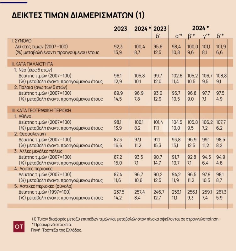 Το δ΄ τρίμηνο του 2024, ο ετήσιος ρυθμός μεταβολής των τιμών των διαμερισμάτων για το σύνολο της χώρας διαμορφώθηκε στο 6,6%. Με βάση την παλαιότητα ακινήτου, ο ετήσιος ρυθμός μεταβολής των τιμών των νέων διαμερισμάτων διαμορφώθηκε στο 9,1% και των παλαιών στο 4,9%.