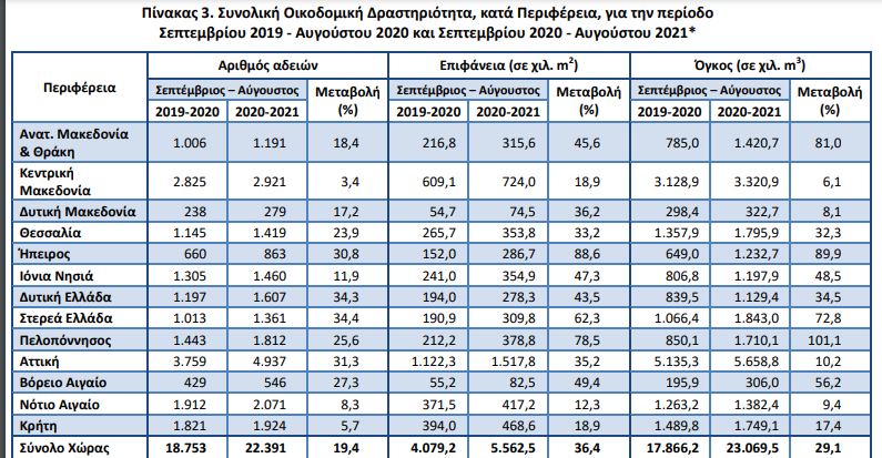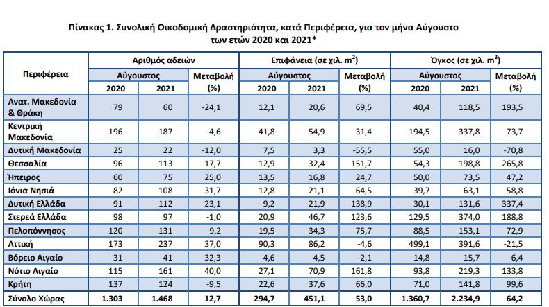 Κατά την περίοδο των τελευταίων δώδεκα μηνών, δηλαδή από τον Σεπτέμβριο 2020 έως τον Αύγουστο 2021, το μέγεθος της Συνολικής Οικοδομικής Δραστηριότητας (Ιδιωτικής-Δημόσιας) με βάση τις εκδοθείσες οικοδομικές άδειες, στο σύνολο της Χώρας, ανήλθε σε 22.391 οικοδομικές άδειες, που αντιστοιχούν σε 5.562,5 χιλιάδες m2 επιφάνειας και 23.069,5 χιλιάδες m3 όγκου.