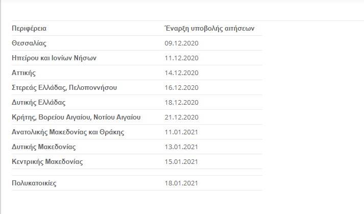 Πρώτον, αναφορικά με το χρονοδιάγραμμα έναρξης υποβολής των αιτήσεων ανά Περιφέρεια, ανακοινώνεται ότι η σχετική διαδικασία θα ξεκινήσει 10 μέρες αργότερα, σε σύγκριση με τον έως τώρα προγραμματισμό που προέβλεπε έναρξη της διαδικασίας υποβολής στις 30 Νοεμβρίου. Το άνοιγμα της πλατφόρμας για τις περιφέρειες της Βορείου Ελλάδας -όπου τα προβλήματα με τον κορωνοϊό είναι εντονότερα- θα μετατεθεί στο τέλος.