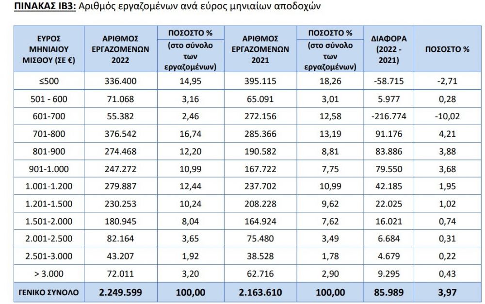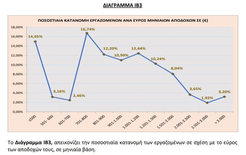 Με λιγότερα από 500 ευρώ το μήνα αμείβονται 336.400 εργαζόμενοι στην Ελλάδα (14,95 %) και μόνο 72.000 μισθωτοί λαμβάνουν περισσότερα από 3.000 μηνιαίως. Οι περισσότεροι εργαζόμενοι στην Ελλάδα και συγκεκριμένα 376.542 άτομα (16,74%) αμείβονται με 701-800 ευρώ μηνιαίως.