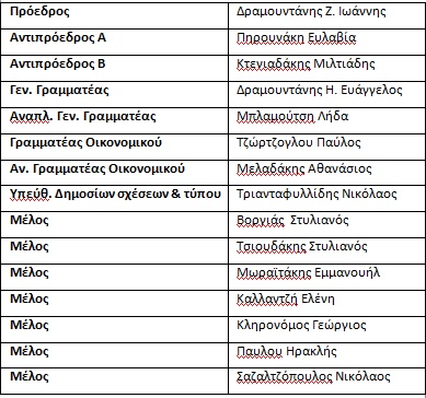 "Μετά από ψηφοφορία και ομόφωνη απόφαση όλων των μελών (15), η νέα σύνθεση του Διοικητικού μας Συμβουλίου έχει ως εξής: