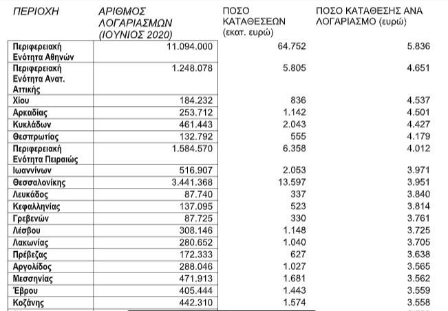 Την πεντάδα συμπληρώνουν οι κάτοικοι στους Νομούς Αρκαδίας και Κυκλάδων, οι οποίοι «μετρούν» 715.155 λογαριασμούς (253.712 και 461.443 αντίστοιχα), με το ύψος των καταθέσεων να υπολογίζεται σε 3,1 δισ. ευρώ ή άνω των 4.000 ευρώ/λογαριασμό. Οι κάτοικοι των Κυκλάδων, πάντως, φέρεται να έχουν χάσει περίπου 145 εκατ. ευρώ σε διάστημα έξι μηνών, γεγονός, που αποδίδεται και στην επίπτωση, που είχε ο κορονοιός στον τουρισμό.