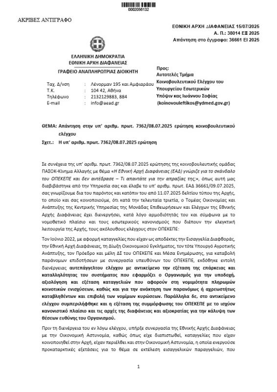 Το μπάχαλο που επικρατεί στον ΟΠΕΚΕΠΕ επιβεβαιώνει και η Εθνική Αρχή Διαφάνειας καθώς ήλεγξε 37 παραγωγούς από Κρήτη, Θεσσαλία και Εύβοια και διαπίστωσε παραβάσεις στους 10.