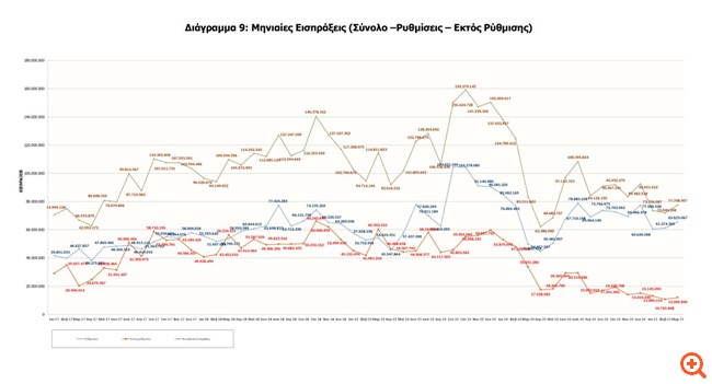 Όσον αφορά τα έσοδα από τις ρυθμίσεις, στο α΄ τρίμηνο του 2021 έφτασαν στο χαμηλότερο σημείο τους από την έναρξη της πανδημίας, καθώς έπεσαν στα 223 εκατ. ευρώ.
