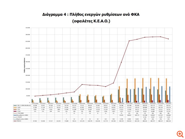 Μία συγκριτική μελέτη των στοιχείων του Κέντρου Είσπραξης Ασφαλιστικών Οφειλών (ΚΕΑΟ) μεταξύ Μαρτίου 2021-Δεκεμβρίου 2020, δείχνει για παράδειγμα μείωση των ενεργών πάγιων ρυθμίσεων κατά 20%.