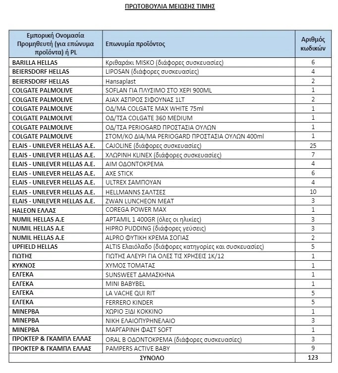 Συνολικά 123 προϊόντα, τα οποία εμφανίζουν μειώσεις από 6% έως 15% έχουν ενταχθεί, σύμφωνα με το υπουργείου Ανάπτυξης, στη νέα πρωτοβουλία που ξεκίνησε πριν από λίγες μέρες στα σούπερ μάρκετ, με στόχο την αποκλιμάκωση των τιμών.