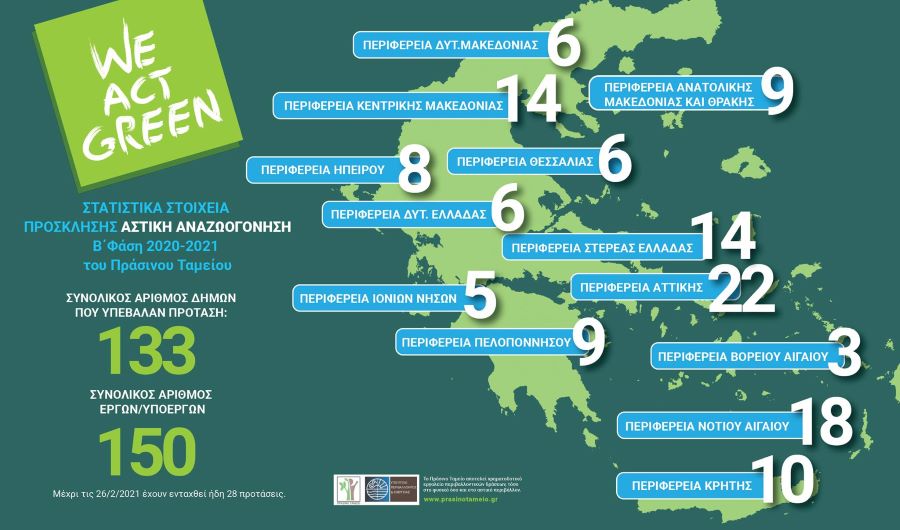 Ολοκληρώθηκε στις αρχές της εβδομάδας η υποβολή προτάσεων έργων στην πρόσκληση Αστική Αναζωογόνηση-Β΄Φάση 2020-2021 του Πράσινου Ταμείου. Υπέβαλλαν εγκύρως και εμπρόθεσμα προτάσεις 133 Δήμοι από όλη τη χώρα για 150 έργα ή υποέργα συνολικά.