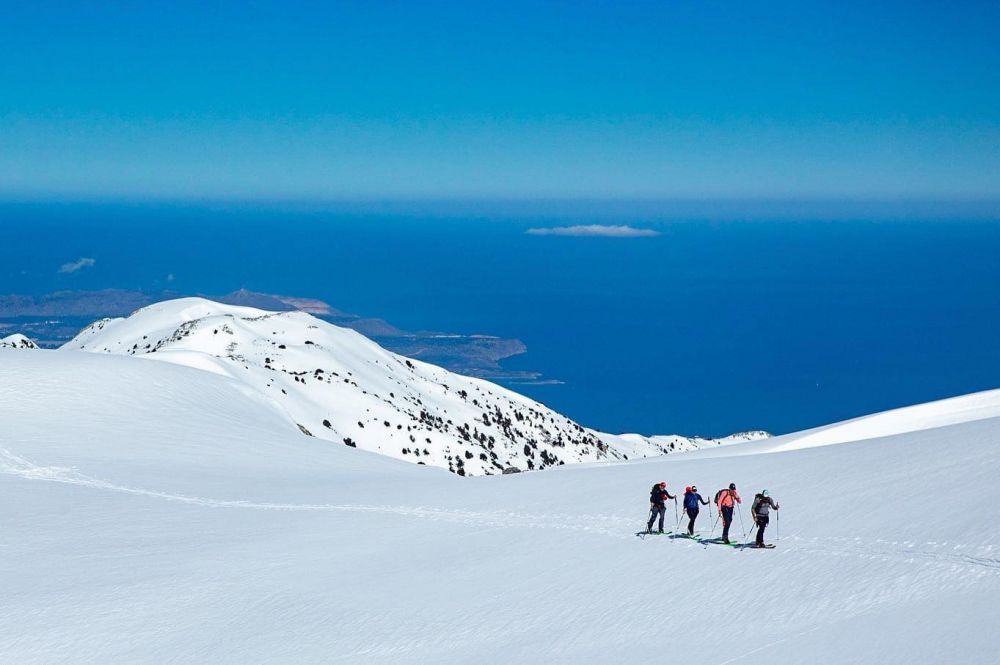 Ο εικονολήπτης ακολούθησε μια ομάδων τολμηρών σκιέρ που έφτασε σε υψόμετρο 2.283 μέτρων, στην κορυφή Άγιο Πνεύμα των Λευκών Ορέων για να συνεχίσει με κατάβαση προς το Καταφύγιο Κατσιβέλι.