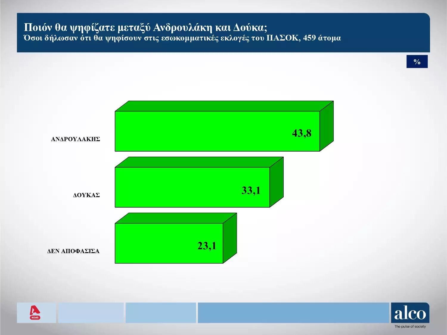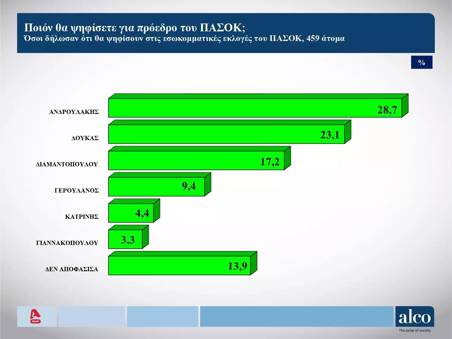Οι εκλογές για την αρχηγία στο ΠΑΣΟΚ και η κατάσταση στον ΣΥΡΙΖΑ καταδεικνύονται στην δημοσκόπηση της Alco για λογαριασμό του Alpha.