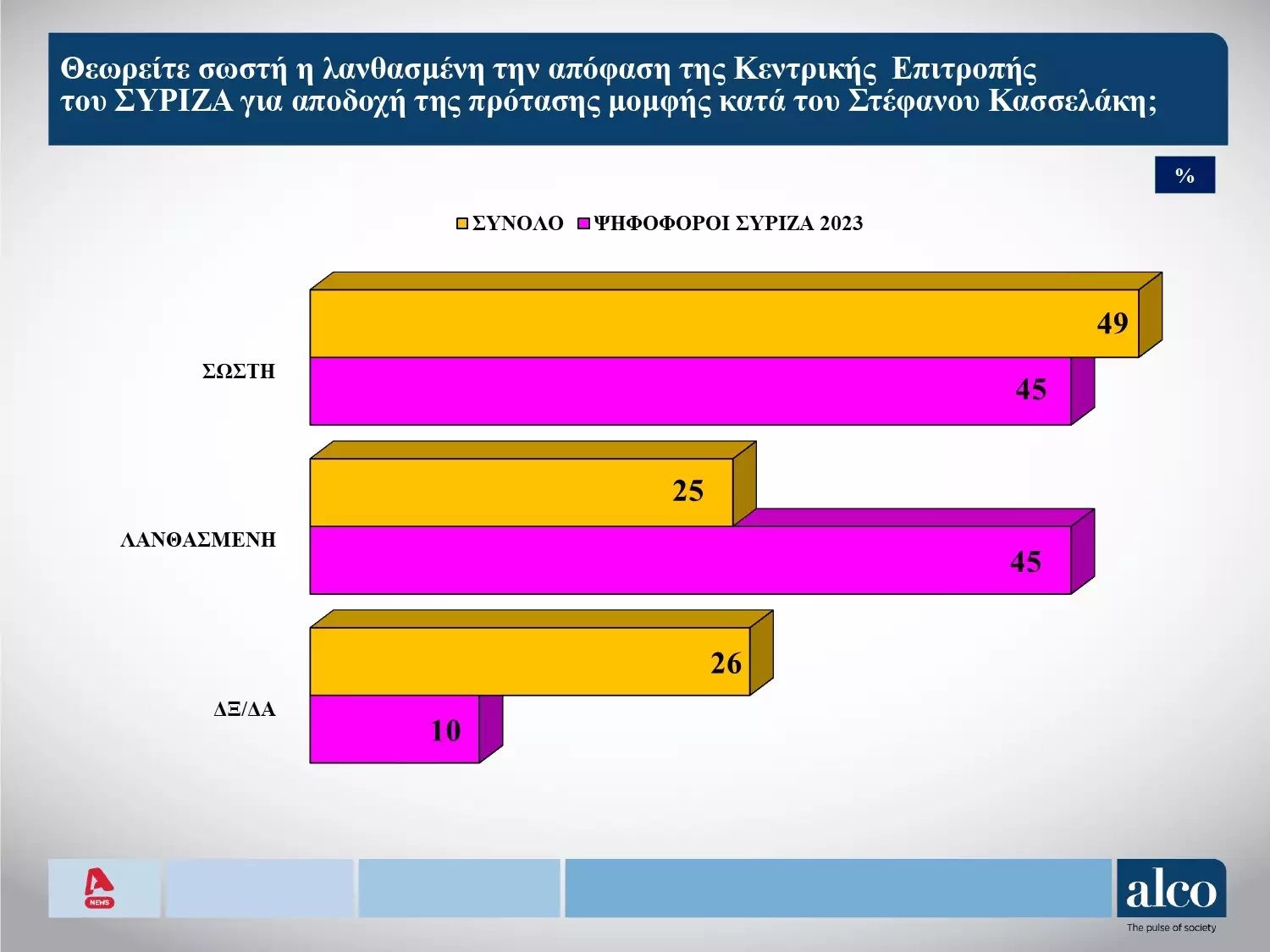 Για τον ΣΥΡΙΖΑ στο ερώτημα αν θεωρείται λανθασμένη την απόφαση της ΚΕ του ΣΥΡΙΖΑ για αποδοχή της πρότασης μομφής κατά του Στέφανου Κασσελάκη το 49% λέει σωστής, το 25% λάθος και το 26% δεν ξέρω/δεν απαντώ.