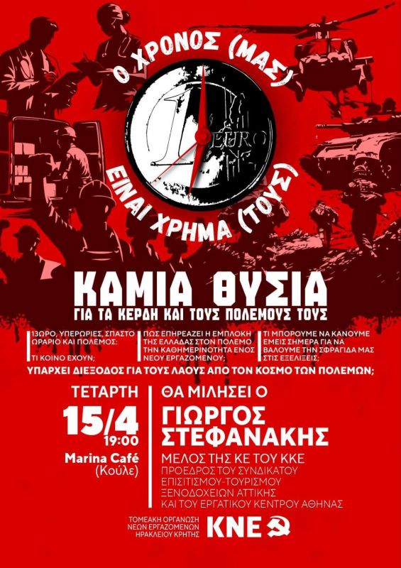 Σύσκεψη-συζήτηση διοργανώνει η Τομεακή Οργάνωση Νέων Εργαζομένων Ηρακλείου της ΚΝΕ, με τίτλο «Ο χρόνος (μας) είναι χρήμα (τους). Καμιά θυσία για τα κέρδη και τους πολέμους τους!».