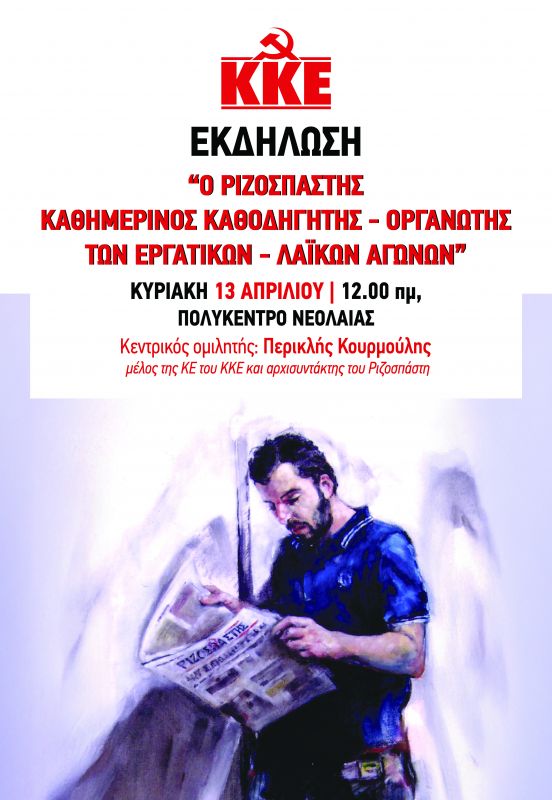 Οι κλαδικές οργανώσεις της Τ.Ο Ηρακλείου του ΚΚΕ και της Τ.Ο εργαζομένων της ΚΝΕ διοργανώνουν εκδήλωση με θέμα : “Ο Ριζοσπάστης Καθημερινός καθοδηγητής – Οργανωτής των Εργατικών – Λαϊκών Αγώνων”, την Κυριακή 13 Απριλίου στις 12μμ, στο Πολύκεντρο Νεολαίας του Δήμου Ηρακλείου με κεντρικό ομιλητή τον Περικλή Κουρμούλη, μέλος της ΚΕ του ΚΚΕ και αρχισυντάκτη του Ριζοσπάστη. Θα ακολουθήσει συζήτηση.