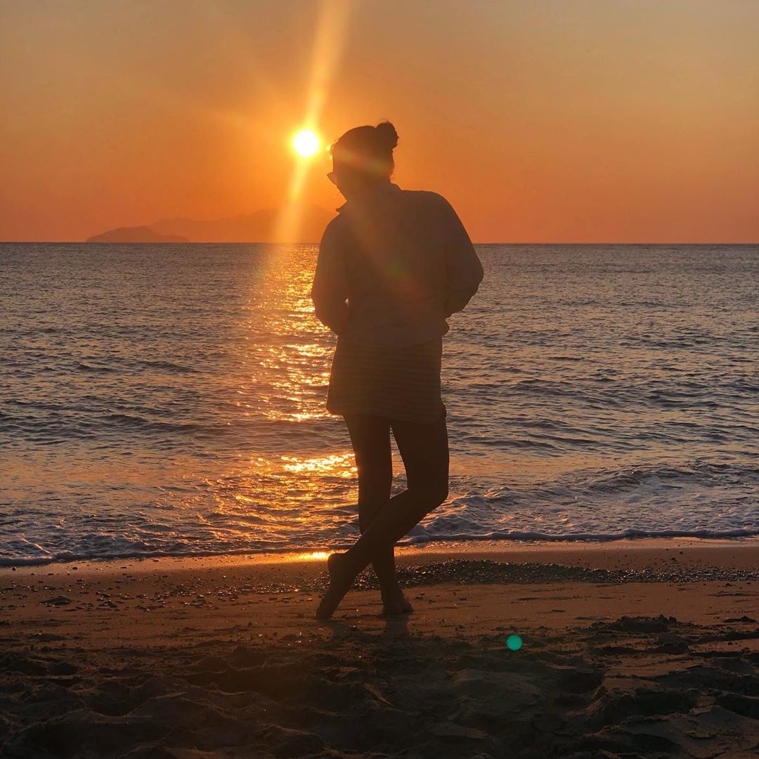 Η ταλαντούχα ερμηνεύτρια ποζάρει πλάτη στον φακό με ένα πουκάμισο τύπου καφτάνι αρχικά και στη συνέχεια με ένα εντυπωσιακό ολόσωμο μαγιό, απολαμβάνοντας το υπέροχο ηλιοβασίλεμα.