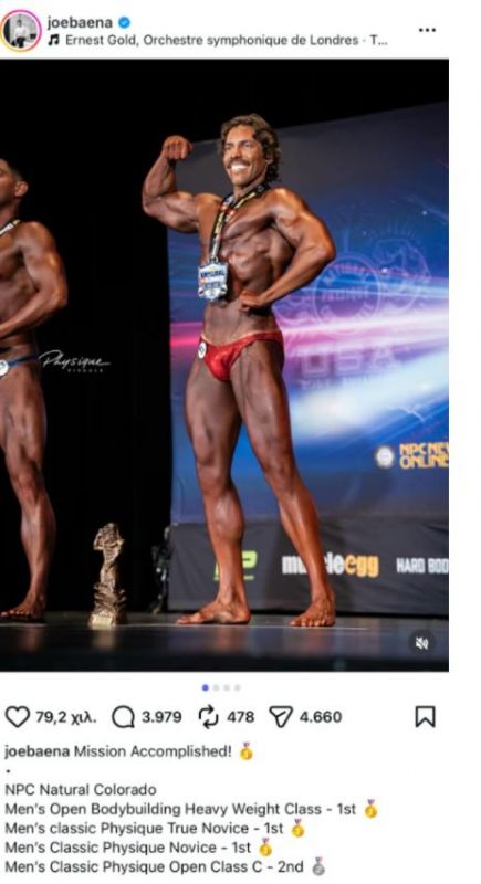Μέσα από τον προσωπικό του λογαριασμό στα μέσα κοινωνικής δικτύωσης, o Μπαένα μοιράστηκε τη νίκη του, δημοσιεύοντας φωτογραφία από τον χώρο του διαγωνισμού, όπου ποζάρει, δείχνοντας το σώμα του. «Αποστολή εξετελέσθη» σημείωσε στη λεζάντα της ανάρτησης που έκανε τη Δευτέρα 30 Μαρτίου στο Instagram.