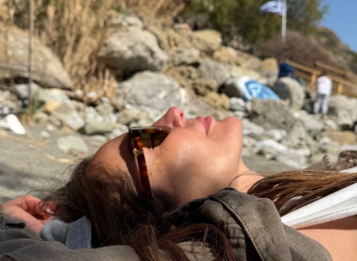 Στη φωτογραφία που μοιράστηκε ο Βασίλης Μπισμπίκης με τους διαδικτυακούς του φίλους στο Instagram, η τραγουδίστρια φαίνεται ξαπλωμένη στην άμμο φορώντας γυαλιά ηλίου και ένα denim τζάκετ.