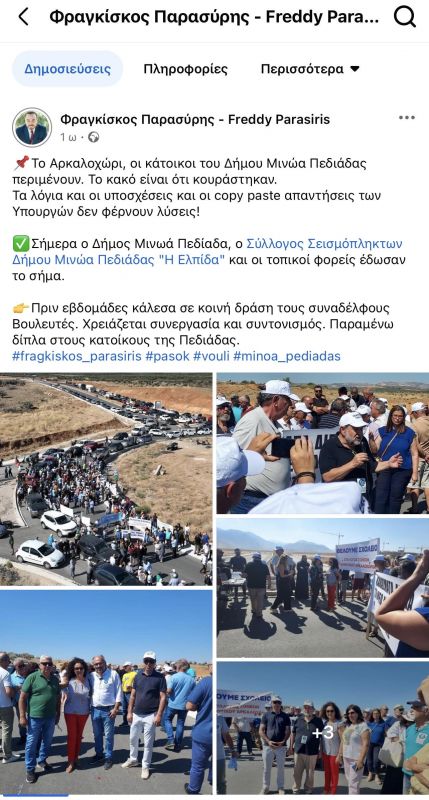 Με αφορμή τη σημερινή κινητοποίηση που διοργανώθηκε από το Δήμο Μινώα Πεδιάδας, το Σύλλογο Σεισμόπληκτων «Η Ελπίδα», με τη συμμετοχή τοπικών φορέων, ο Φραγκίσκος Παρασύρης έκανε την ακόλουθη δήλωση.