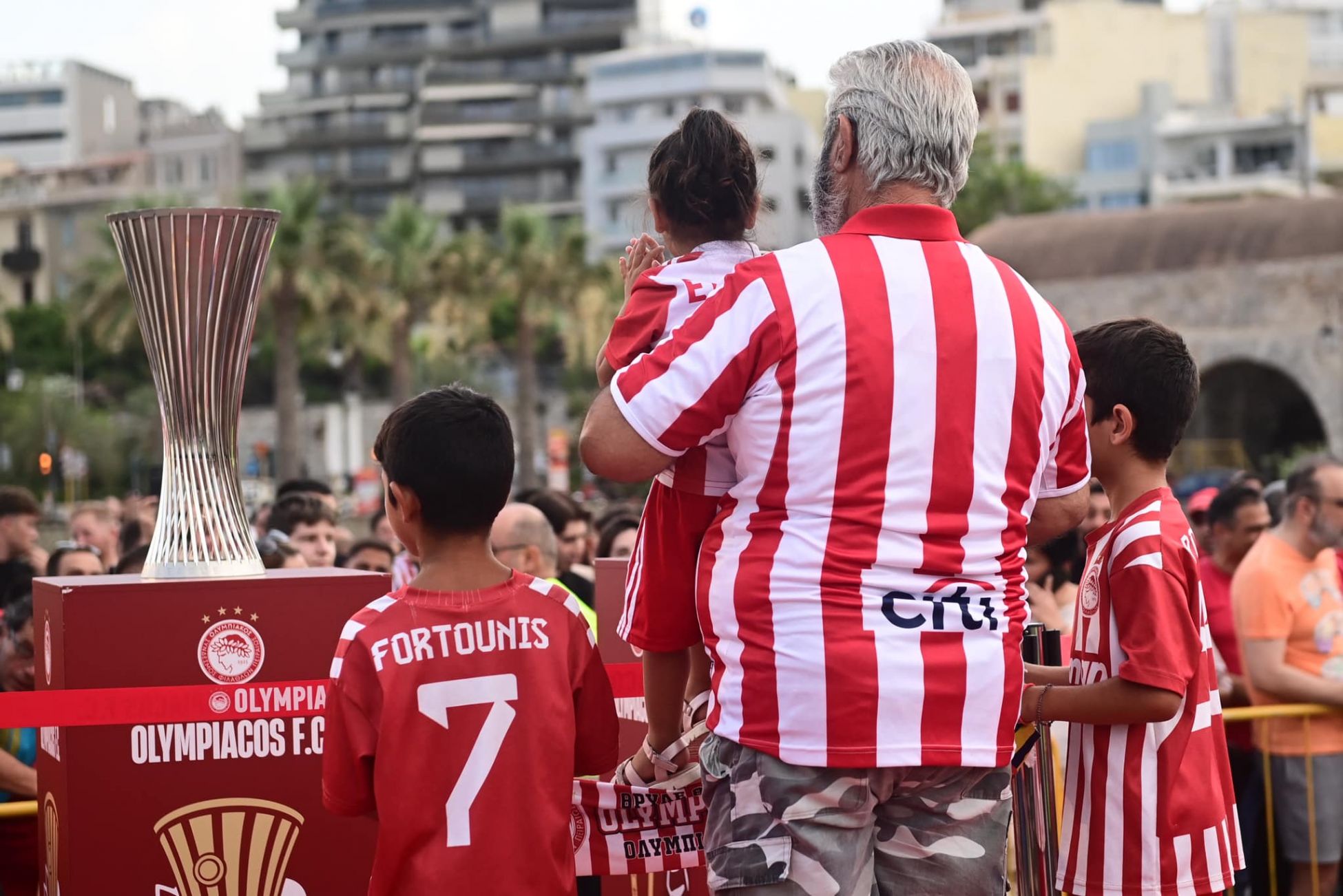Οι στιγμές ήταν συγκινητικές, παραπέμποντας και στους αγώνες που έδωσαν πρόσφατα οι ερυθρόλευκοι προκειμένου να καταφέρουν να κατακτήσουν τα δύο κύπελλα.