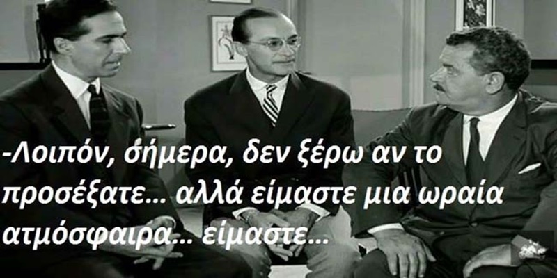 «Είμαστε μια πολύ ωραία ατμόσφαιρα!» που θα έλεγε και ο Ηλιόπουλος… Αυτή είναι η εικονα σε συγκεκριμένη δημοτική παράταξη, που διευρύνει μέλη και υποψηφίους συνεχώς και φλερτάρει με την νίκη στις επερχόμενες εκλογές…Που το αστείο και η ειρωνία; Μα εάν δείτε με τι «χαρά», η αρχική ολιγομελής ομάδα, υποδέχεται τους επόμενους, είναι τόσο χαρακτηριστική, που προκαλεί γέλια εάν όχι κλάματα… Δηλαδή, εκπέμπει νοοτροπία «ήρθαν οι νέοι, να μας φάνε το έτοιμο «πιάτο»… Βρε «σαΐνια», έχετε καταλάβει ότι εάν δεν υπήρχαν οι «νέοι», στην κάλπη, δε θα βρισκατε ούτε την ψήφο σας; Αλλά αυτό που να σας περάσει από το μυαλό! Πάντως περί ομοψυχίας... κολοκυθόπiτα!