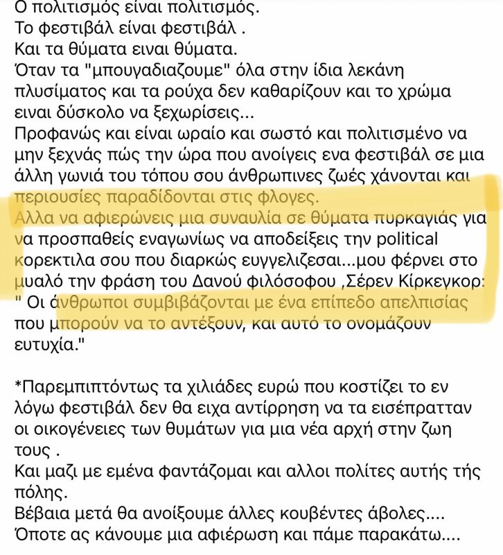 Ξεκινάω όμως με το ηθικό «φάουλ»… Στο δήμαρχο Βασίλη Λαμπρινό, μπορεί κάποιος να ασκήσει κριτική πάνω στο έργο του για λάθη ή παραλείψεις, αλλά σίγουρα κανείς λογικός άνθρωπος δεν μπορεί να κατηγορήσει ότι… «προσπαθείς εναγωνίως να αποδείξεις την political κορεκτιλα σου που διαρκώς ευαγγελίζεσαι»(!) όπως έκανε, πριν 3 μέρες με σχόλιο στο FB, πρώην υποψήφια βουλευτής και νυν υποψήφια δημοτική σύμβουλος!! Ο Δήμαρχος, για όσους τον γνωρίζουν έστω και στο ελάχιστο, ποτέ δεν συμπεριφέρθηκε με κριτήρια του «politically correct», παρέμεινε παντα άνθρωπος χαμηλών τόνων, σεμνός, μακριά από κάθε είδους «δηθενιές»… Αντίθετα, εάν είναι κάτι που τον χαρακτηρίζει είναι μία βαθιά, έμφυτη, αστική ευγένεια, την οποία του αναγνωρίζουν οι πάντες… Όποτε εντελώς άστοχο το σχόλιο..