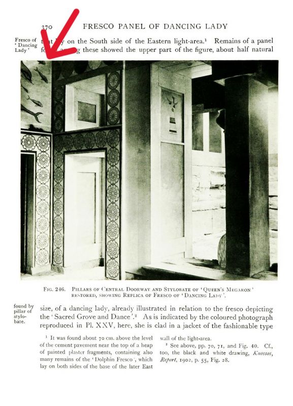 Στα της Κνωσού και επειδή μας τα είπε λίγο περίεργα, η καθόλα αγαπητή κα Μενδώνη, (σε σχετική επερώτηση του Φραγκίσκου Παρασύρη) θα ήθελα να προσθέσω ότι η επίμαχη τοιχογραφία δεν είχε «αντικατασταθεί» την δεκαετία του 1960 αλλά από το 1930! Παραθέτω τη σχετικη έκδοση του Εβανς (The Palace of MINOS AT KNOSSOS By sir ARTHUR EVANS-1930) με την σχετική φωτογραφία να απεικονίζει την τοιχογραφία...