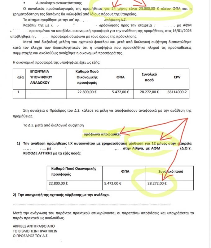 Υπάρχει θεσμικός «φορέας» του τόπου, που μάλλον θέλει να μας τρελάνει: To ΔΣ του «φορέα», παίρνει ομόφωνα απόφαση, στην άρχή του έτους, για leasing αυτοκινήτου (προκειμένου να καλύψει τις μεγάλες του ανάγκες; ), διαθέτοντας 28.520 € (23.000 χωρίς ΦΠΑ) για 24 μήνες και αποφασίζει να στείλει πρόσκληση σε σχετική εταιρεία για προσφορά. Περνούν λίγες ημέρες… κάπου προς το τέλος Ιανουαρίου 2026 το ΔΣ του φορέα, αποδέχεται ομόφωνα την προσφορά της εταιρείας για ποσό 28.272 € αλλά για μόλις 12 μήνες (!) και της το αναθέτει! (Εννοείται ότι το ποσό είναι μεγάλο ακόμα και για 24 μήνες!)