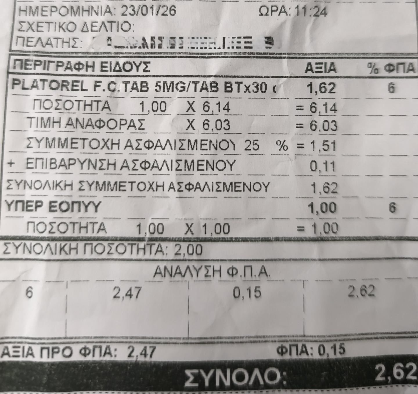 Σε χώρες …ούτε τύπου μπανανίας δεν συμβαίνουν! Αλλά συμβαίνει στη χώρα του παραλόγου και της άρπα κόλας. Πας να πάρεις ένα φάρμακο ως ασφαλισμένος που τα σκας κάθε μήνα με τις εισφορές σου (και ο εργοδότης) και πληρώνεις τα εξής στο φαρμακείο: -Συμμετοχή ασφαλισμένου 25% -Επιβάρυνση (!) ασφαλισμένου -Υπέρ ΕΟΠΠΥ ένα ευρώ! -ΦΠΑ 6% Δείτε την απόδειξη του φαρμακείου στη χώρα …μπανανίας. (κάτι τέτοιο συμβαίνει και με την φορολόγηση στα καύσιμα!)