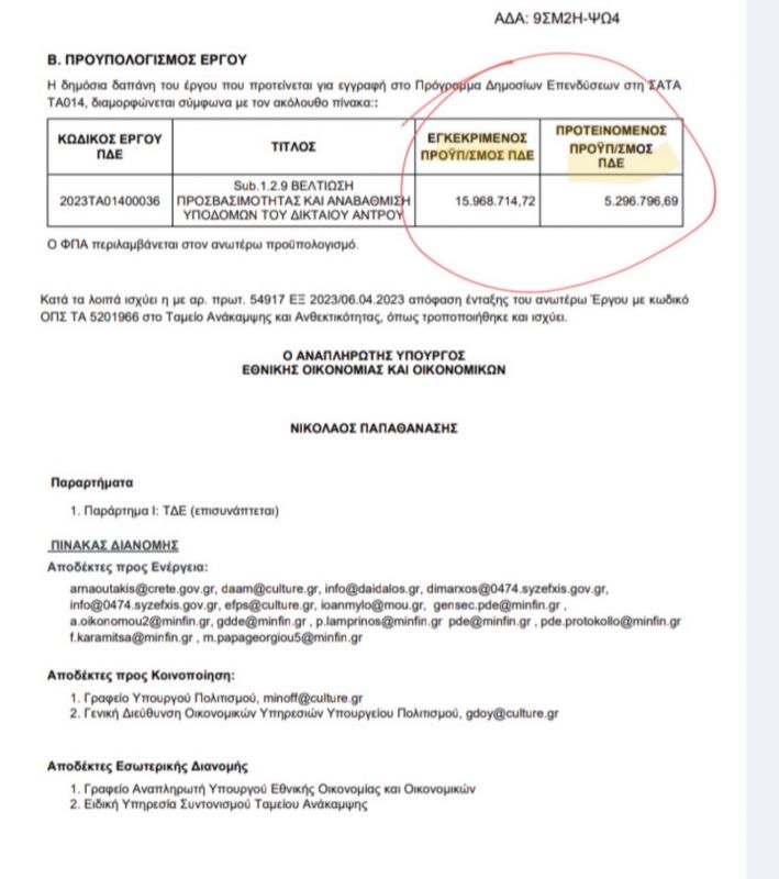 Το έργο «Sub.1.2.9 Βελτίωση Προσβασιμότητας και Αναβάθμιση Υποδομών του Δικταίου Άντρου» (κωδικός ΟΠΣ ΤΑ 5201966) εντάχθηκε στο Ταμείο Ανάκαμψης και Ανθεκτικότητας και υπογράφηκε από τον περιφερειάρχη Κρήτης Σταύρο Αρναουτάκη, την υπουργο πολιτισμού Λίνα Μενδωνηκαι τον τότε δήμαρχο Οροπεδίου Λασιθίου Γιάννη Στεφανάκη τον Μάιο 2023. Το έργο μοναδικό και πρωτόγνωρο για τα ορεινά της Κρήτης θα ήταν το μοναδικό τελεφερίκ, που θα συνέδεε το σπήλαιο του Δία με το χωριό Ψυχρό. Δυστυχώς παρά τις αντίθετες διαβεβαιώσεις και καθησυχάσεις από την νέα Δημοτική Αρχή, το έργο απενταχθηκε, μετά την αλλαγή της μελέτης από τελεφερίκ σε επίγειο ανελκυστήρα, τη διακοπή της Μελέτης Περιβαλλοντικών Επιπτώσεων και την καταστρατήγηση του χρονοδιαγράμματος του έργου, (τουλάχιστον από αυτά που εως τώρα γνωρίζουμε). Ετσι φτασαμε τελικά στην απώλεια της χρηματοδότησης και από τα 15 εκατομμύρια απομένουν μόλις 5, δημιουργώντας πολλαπλά ερωτηματικά για το τι έγινε επι τούτου τους τελευταίους 27 μήνες...