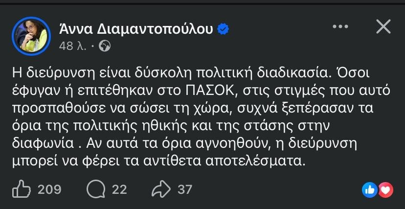 Στο ΠΑΣΟΚ, κάποιοι έχουν πέσει σε περιδίνηση ενόψει και του Συνεδρίου! Γκρίνια για την…περίφημη διεύρυνση, με τελευταίο παράδειγμα την έντονη διαφωνία της Άννας Διαμαντοπούλου στην επιλογή του Θεοδόση Πελεγρίνη για την Επιτροπή Διεύρυνσης. Η Άννα, μιλάει σκληρά για όσους «έφυγαν ή επιτέθηκαν στο ΠΑΣΟΚ, στις στιγμές που αυτό προσπαθούσε να σώσει τη χώρα»… Τώρα βέβαια, να μην θυμηθούμε κι εμείς τις, "βαρύγδουπες" δηλώσεις της… Αννούλας όταν η ίδια τρέχοντας, έφευγε από το ΠΑΣΟΚ και μιλούσε για "νεκρή παράταξη"! Άστα βρε Άννα, «καλλιά 'ν' τα αμίλητα, παρά τα μιλημένα» που λέμε και στη Κρήτη!