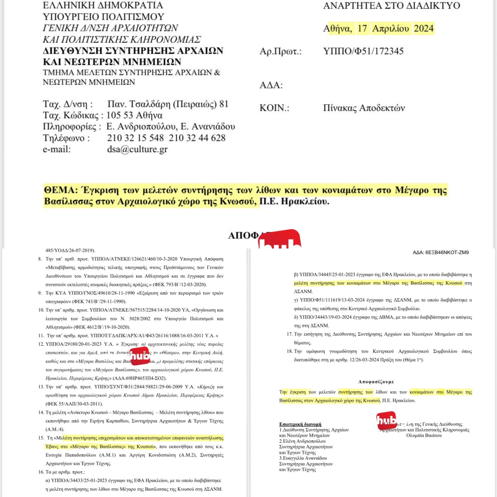 Τώρα που λέω για την Κνωσό: Το newshub.gr και η «στήλη», αποκαλύπτουν σήμερα, ότι το υπουργείο είχε εγκρίνει σχετικές μελέτες για την συντήρηση λίθων, κονιαμάτων και επιχρισμάτων στη Κνωσό από τον Απρίλιο του 2024!!! Και τα ερωτήματα είναι καταιγιστικά: Για να υπάρξει ανάγκη για μελέτες (οι οποίες και μετά εγκρίθηκαν) όλοι γνώριζαν ότι στον μοναδικής αρχαιολογικής σπουδαιότητας χώρο υπήρχαν σοβαρά θέματα… Γιατί μετά, ακολούθησε το...τίποτα;Μετά τις μελέτες, έγινε κάποιος διαγωνισμός, ώστε να προχωρήσει στην υλοποίηση τους; Εκρίθηκαν κάποια κονδύλια; Ή μήπως τα λεφτά του Ταμείου Ανάκαμψης, που θα μπορούσαν να καλύψουν τις ανάγκες του έργου, έχουν μόνο συγκεκριμένους αποδέκτες;;; Αυτά, γιατί δηλώσεις από επίσημα χείλη του στιλ: «δεν γνωρίζω», «δεν ξέρω» και «δεν είδα», όχι απλά δεν ισχύουν αλλά γίνεται και να αποπροσανατολήσουν την κοινή γνώμη! Καμαρώστε: