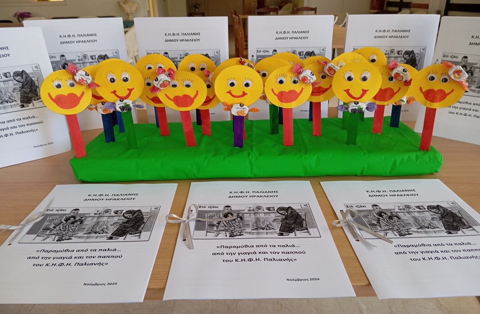 Επίσης, παρέλαβαν έντυπο υλικό σε μορφή «βιβλιοπαραμυθιού» που περιλαμβάνει όλα τα παραμύθια που αφηγήθηκαν τα μέλη και καταγράφηκαν από την Κοινωνική λειτουργό του Κέντρου, στο πλαίσιο λειτουργίας της ομάδας ανάκλησης αναμνήσεων και συναισθημάτων. Τα παιδιά προσέφεραν στους ωφελούμενους ένα όμορφο κολάζ και σκόρπισαν χαμόγελα χαράς με το δικό τους τραγούδι. Η δράση πραγματοποιήθηκε στο χώρο που στεγάζεται το Κέντρο στο Βενεράτο σε συνεργασία με το Νηπιαγωγείο Δαφνών. Το Κ.Η.Φ.Η. Παλιανής ευχαριστεί θερμά για την συνεργασία την προϊσταμένη του Νηπιαγωγείου Δαφνών .Ελένη Σκουρβουλιανάκη, τις εκπαιδευτικούς, Μαρία Περδικάκη, Ειρήνη Ξυλούρη και Μαριλένα Μανωλακάκη που συνόδευσαν τους μικρούς μαθητές και τη Φιλία Μαραγκάκη για την ευγενική χορηγία του καταστήματός της στις Δαφνές, στο κέρασμα που προσφέρθηκε.