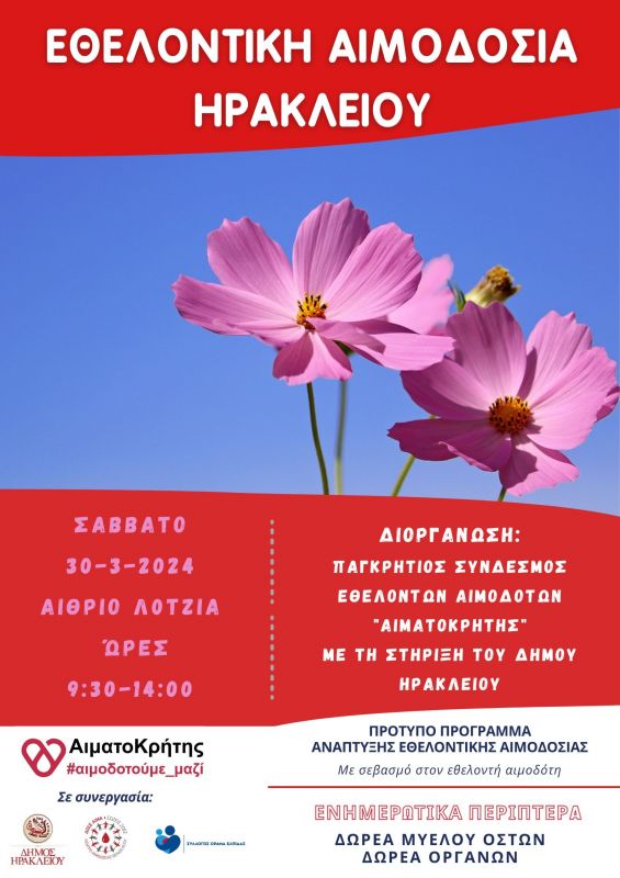 Το Σάββατο 30/03/2024 και θα πραγματοποιηθεί εθελοντική αιμοδοσία στο κέντρο της πόλης του Ηρακλείου και συγκεκριμένα στο αίθριο της Λότζια από τις 9:30 έως τις 14:00.