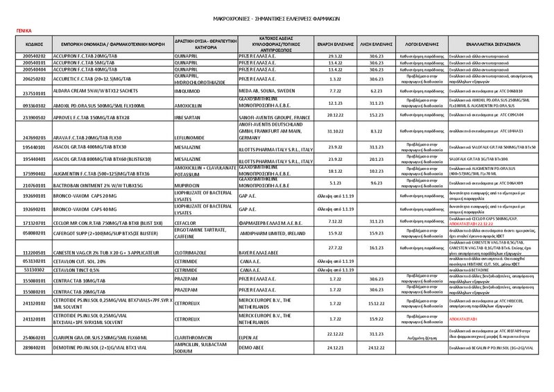 Στη λίστα περιλαμβάνονται 71 φάρμακα κοινότητας, 20 νοσοκομειακά, 6 εμβόλια και 65 σκευάσματα αρμοδιότητας του Ινστιτούτου Φαρμακευτικής Έρευνας και Τεχνολογίας (ΙΦΕΤ).